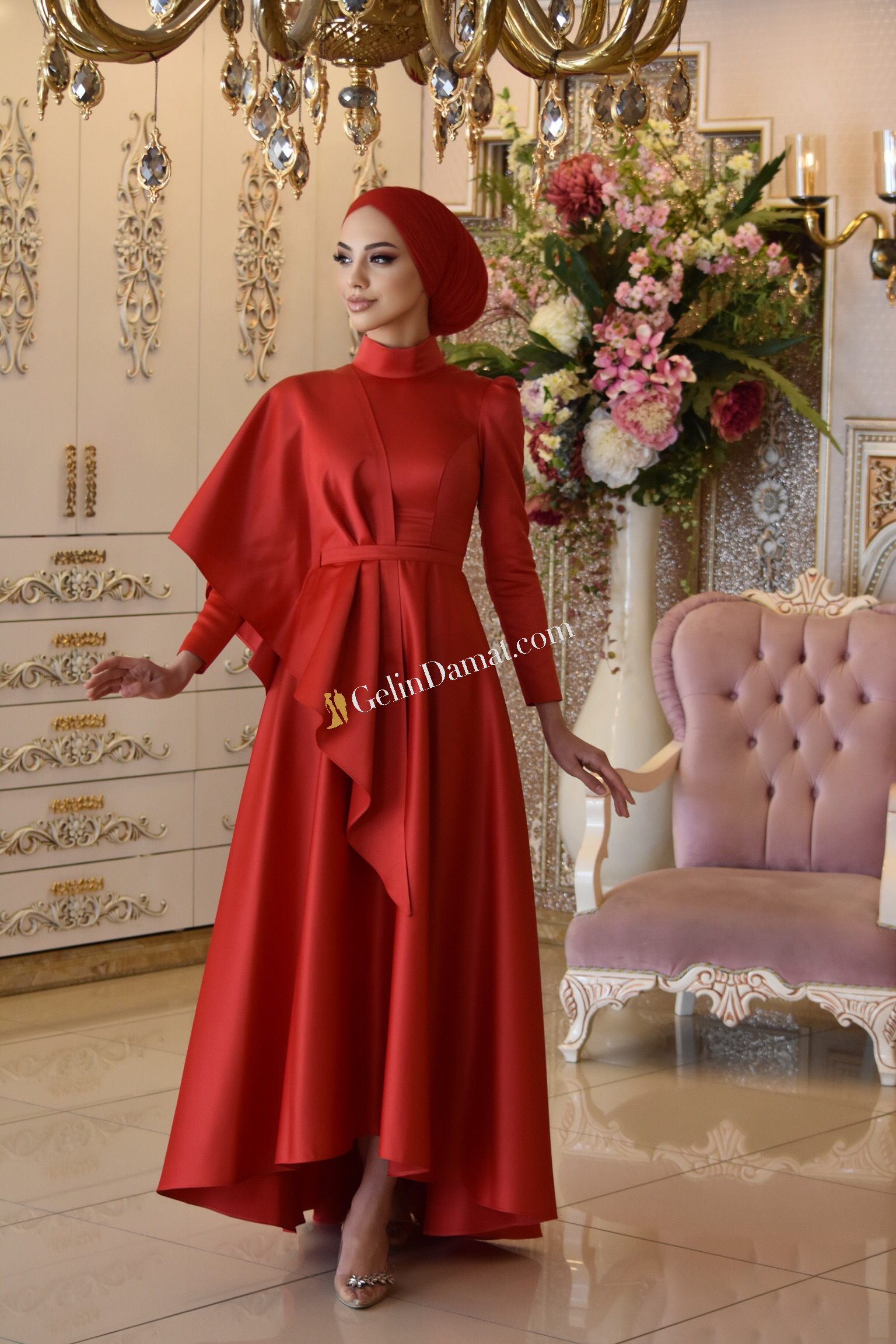 KIRMIZI renginde saten kumaş tek omuz pelerin detaylı beli ince kemerli bilek boy oval kuyruk detaylı tasarım abiyelerimiz Mahidevran güvencesiyle özel günlerinizin favorisi olacaktır