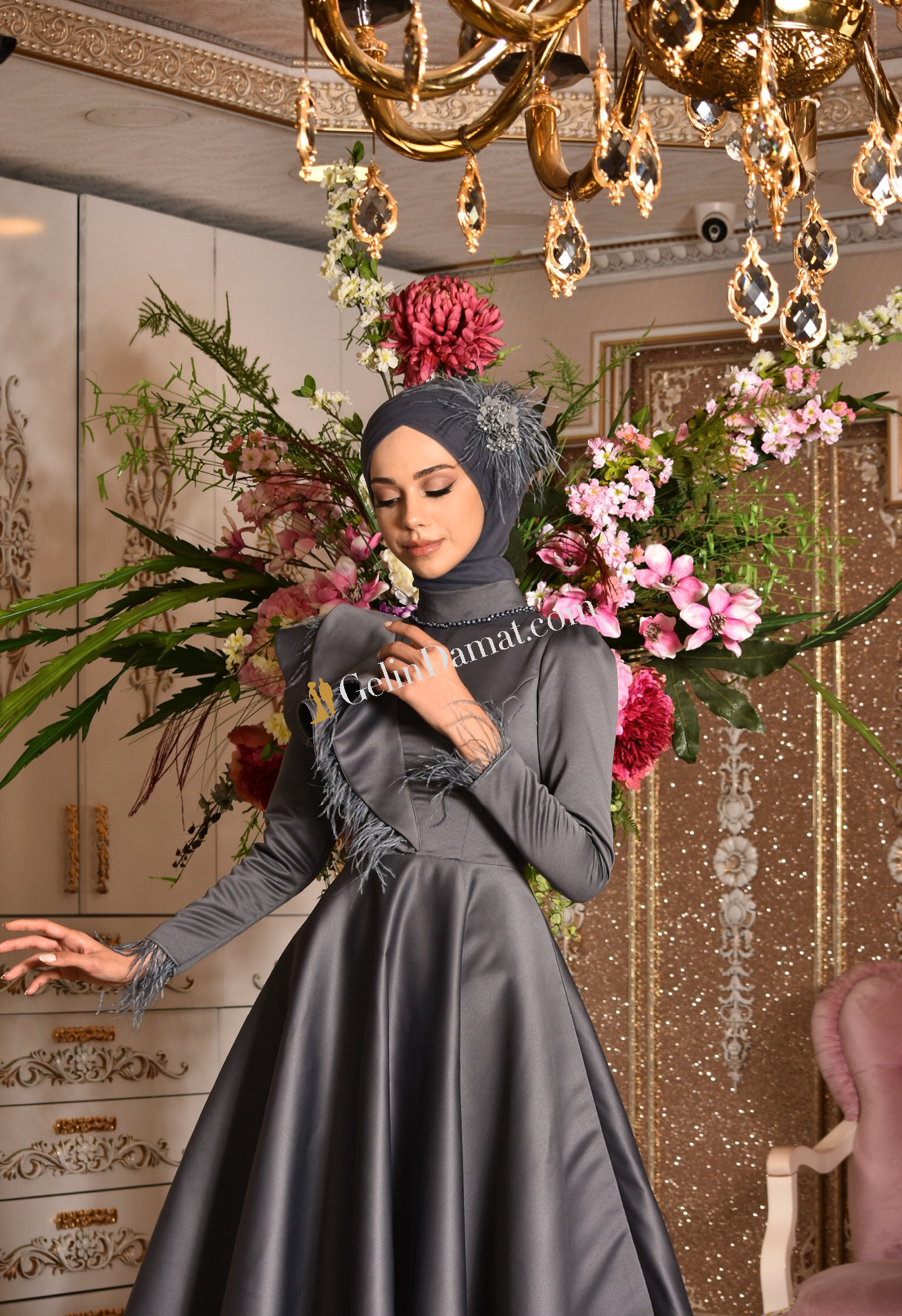 GRİ RENGİ OTRİJ MANŞETLİ OMUZDA HELEZYON DETAYLI SATEN KUMAŞTAN YAPILMIŞ KLOŞ KESİM MİDİ BOY ÖZEL GÜN KOSTÜMÜDÜR.MAHİDEVRAN GÜVENCESİYLE..