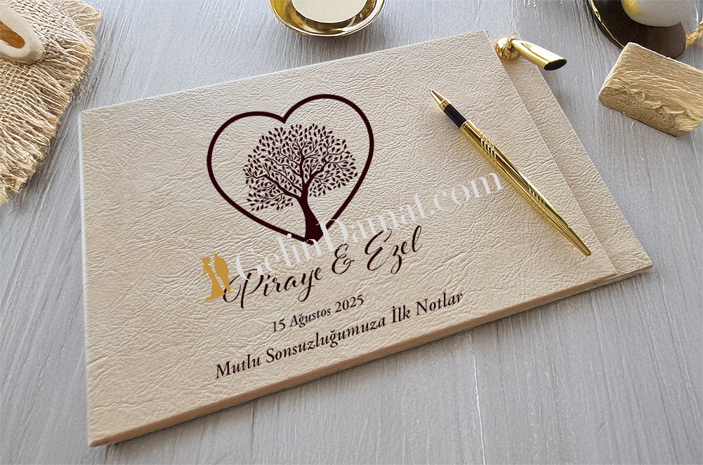 Kalp ağaç deseniyle süslenmiş bu özel anı defteri, düğün ve nişan gibi anlamlı günlerinizi ölümsüzleştirmeniz için tasarlandı. Gelin ve damadın isimleri, özel tarih ve duygusal notlarla kişiye özel olarak hazırlanan bu defter, anılarınızı saklamanın en zarif yolunu sunar. Sipariş verirken isim ve tarih bilgilerinizi eklemeyi unutmayın.