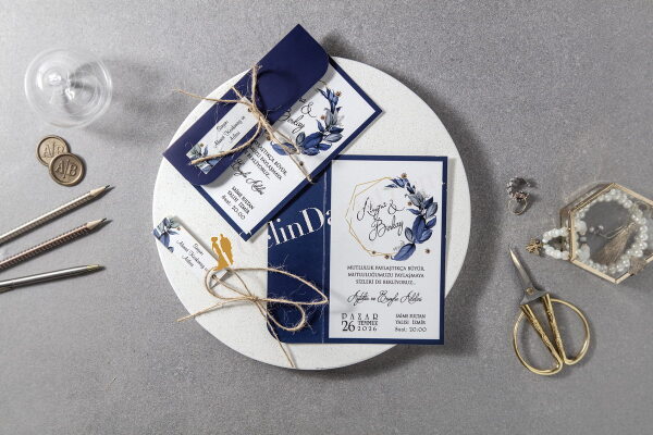 Gelince Haber VerLacivert Çiçek Detaylı Zarif Davetiye, şıklığı ve doğallığı bir araya getiren göz alıcı bir tasarıma sahiptir. Lacivert tonlarının asilliği, zarif çiçek desenleri ve doğal ip bağlama detayıyla birleşerek hem modern hem de romantik bir görünüm sunar. Özel günlerinizde davetlilerinize unutulmaz bir ilk izlenim bırakmak için ideal bir seçimdir.