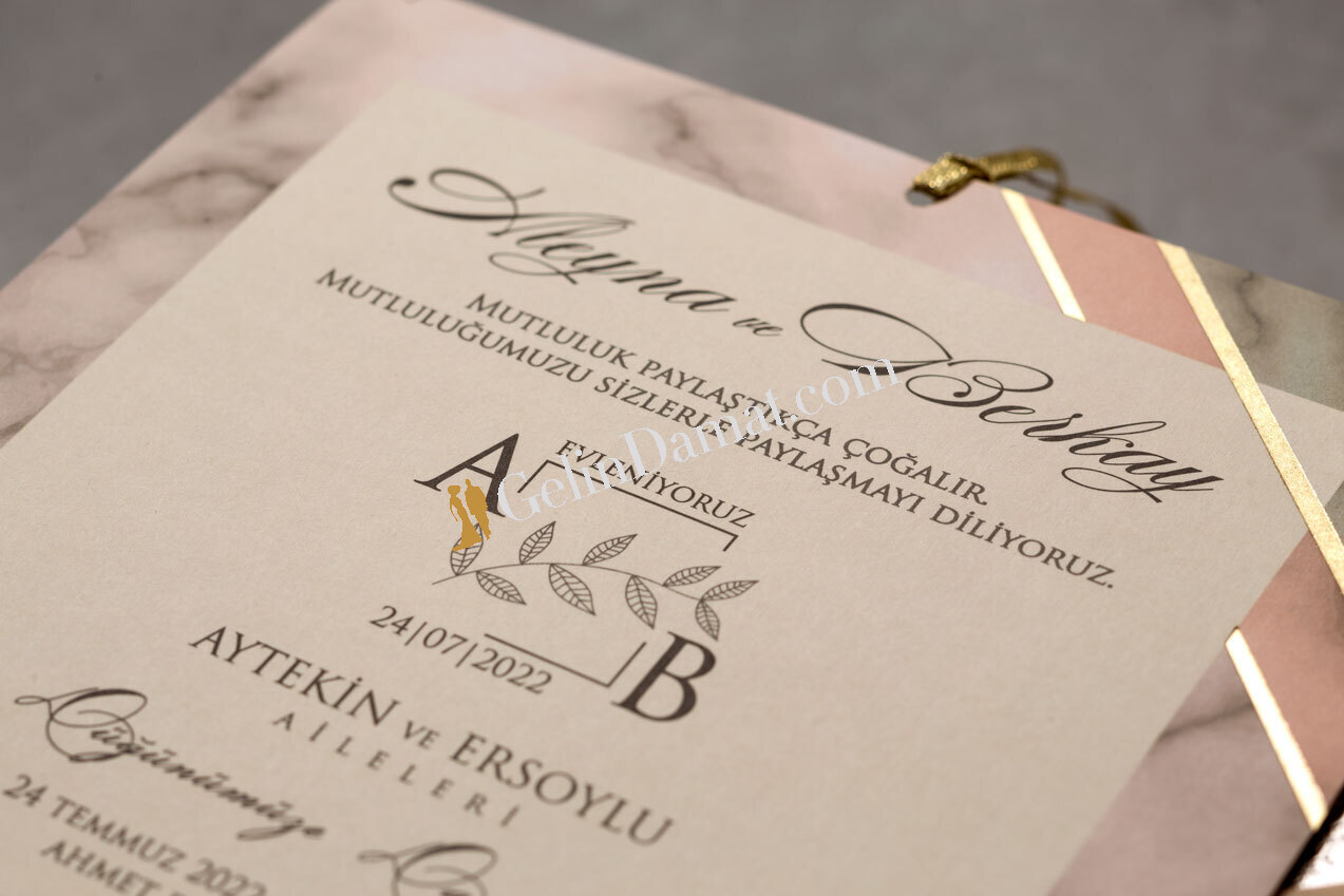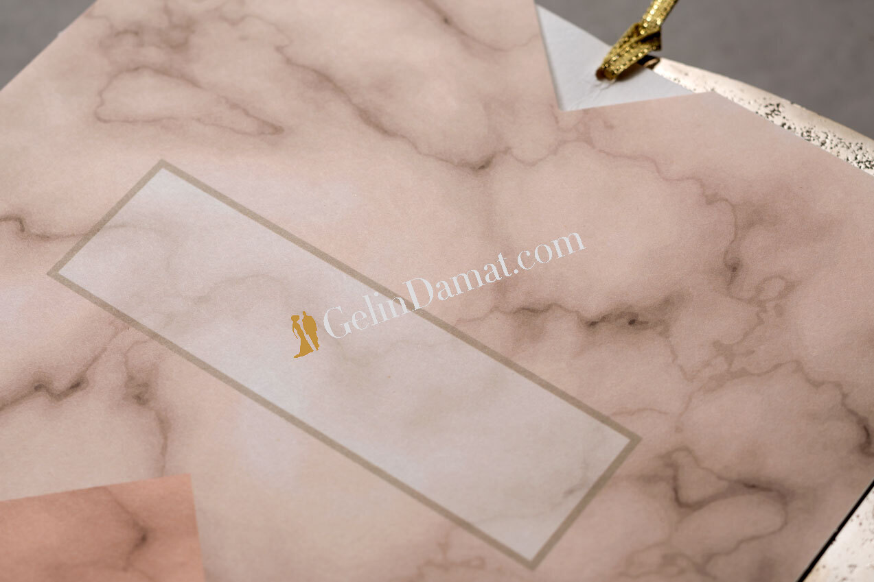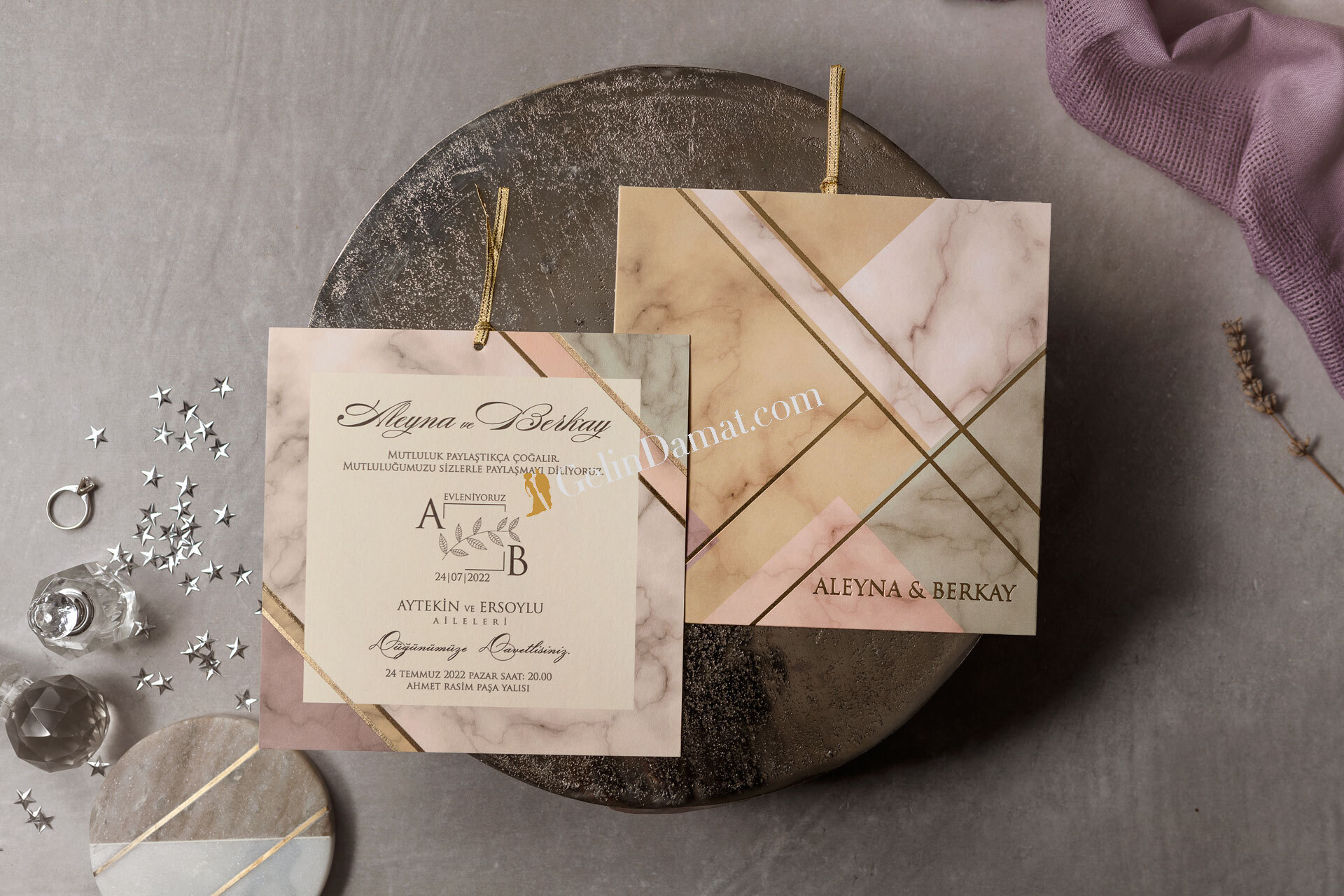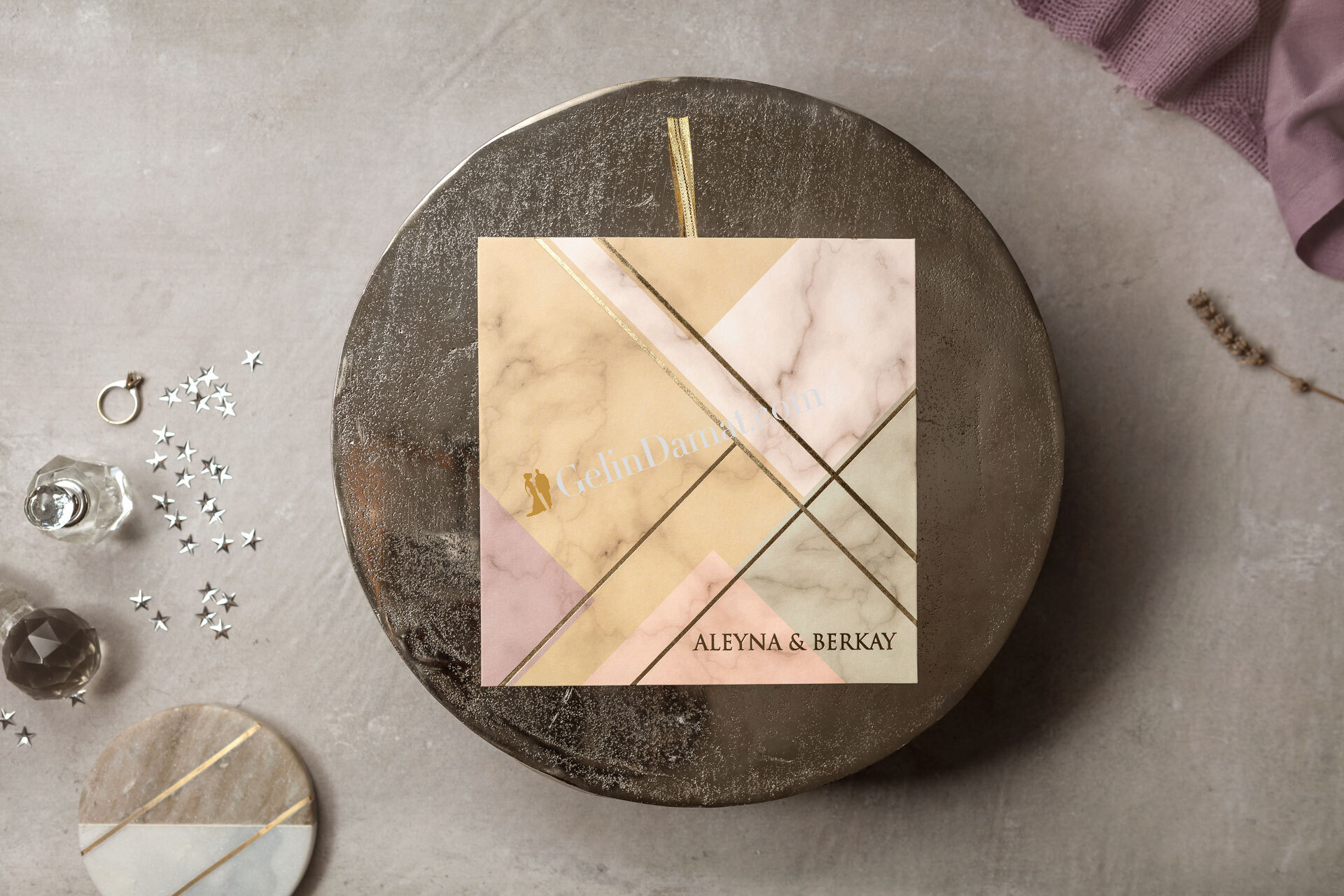 Mermer Desenli Geometrik Modern Davetiye zarif mermer dokusu ve şık geometrik desenleriyle özel günlerinizi unutulmaz kılacak. Soft tonların zarif birleşimi ve altın detaylarla bezenmiş bu davetiye, modern bir dokunuşla geleneksel zarafeti bir araya getiriyor. Gelin Damat Davetiye markasının özenle hazırladığı bu tasarım, düğün, nişan ve diğer özel organizasyonlarınız için mükemmel bir seçenek. Şıklığı ve özgünlüğüyle davetinizin unutulmaz olmasını sağlar.