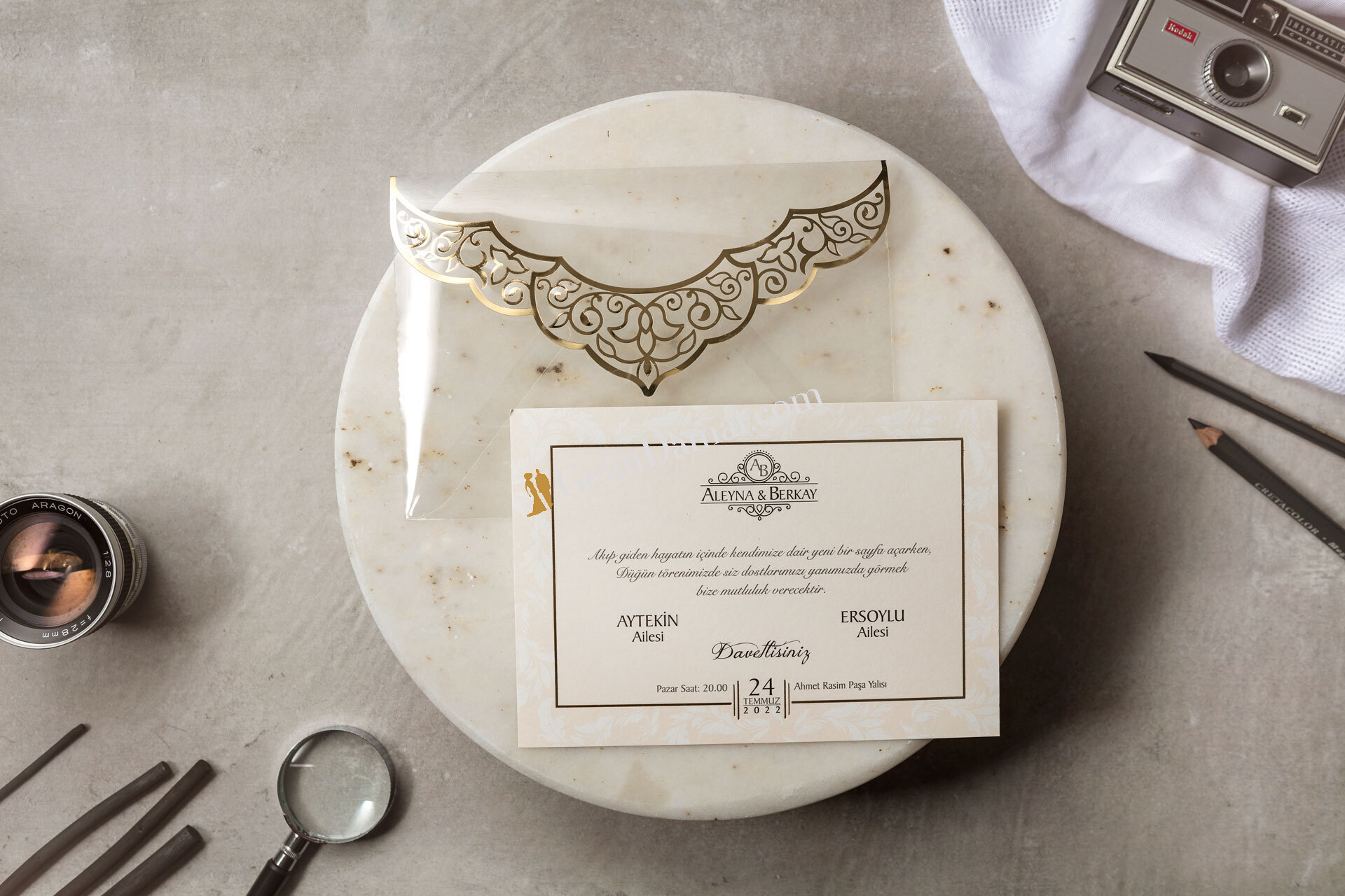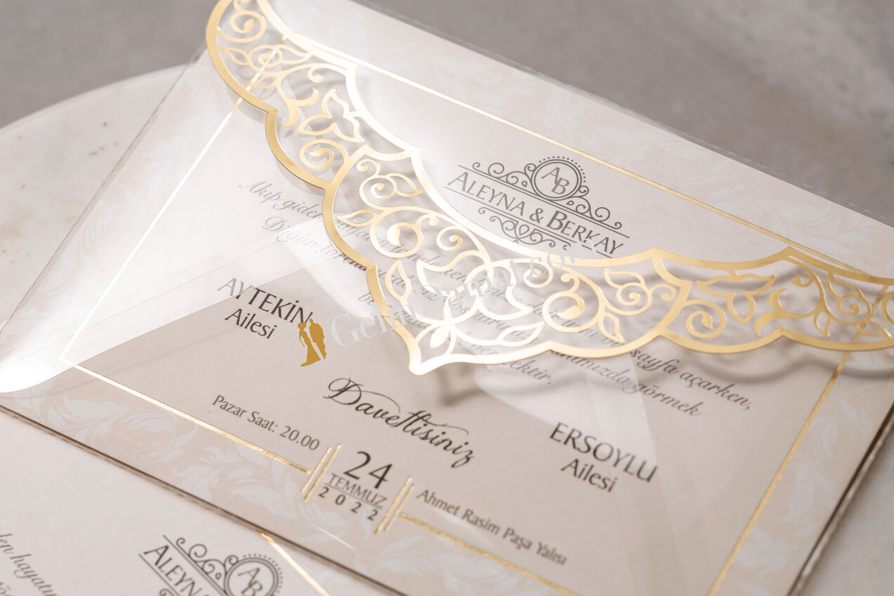 Notify me when its in stockGelin Damat Davetiye markasının zarif tasarım anlayışıyla üretilen Şeffaf Yaldız Baskılı Davetiye, şıklığı ve zarafeti bir araya getiriyor. Düğün davetiyesi fiyatlarına KDV dahildir. Şeffaf yapısı ve yaldız baskı detayları, davetiyenize zarif bir ışıltı katarken, modern ve şık bir görünüm sunar. Yüksek kaliteli malzeme kullanımı ve estetik tasarımı, düğün, nişan ve diğer özel organizasyonlar için mükemmel bir seçenek oluşturur.