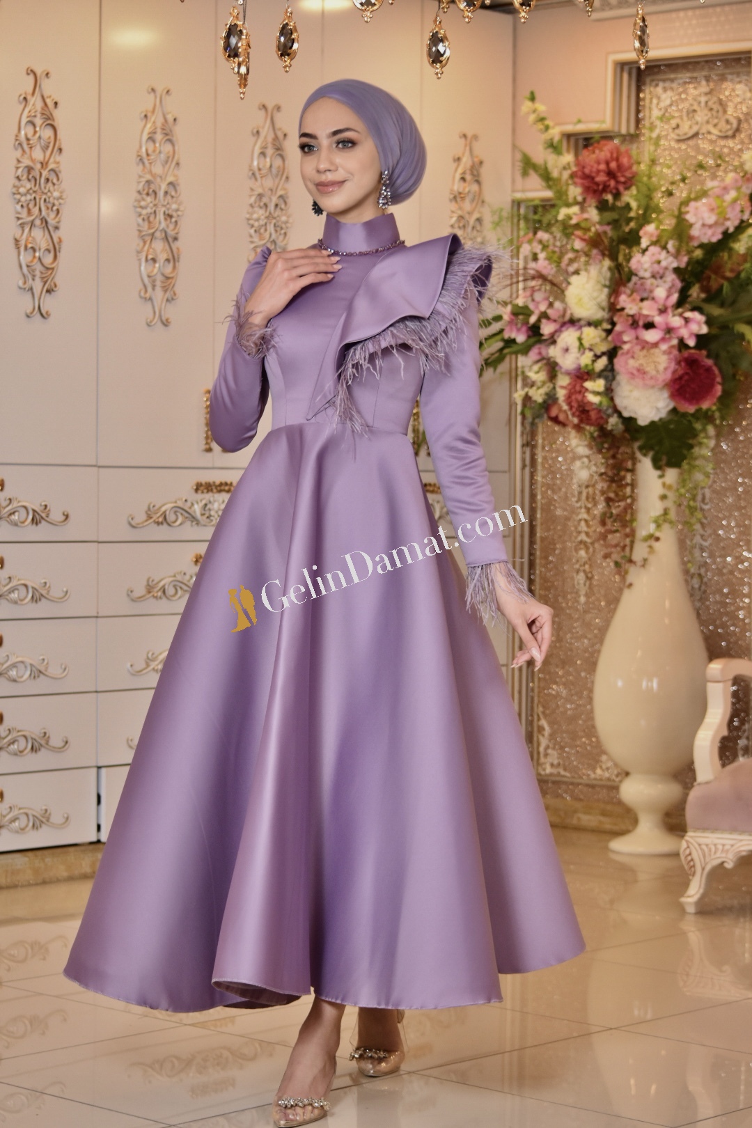 LİLA RENGİ OTRİŞ MANŞETLİ OMUZDA HELEZYON DETAYLI SATEN KUMAŞTAN YAPILMIŞ KLOŞ KESİM MİDİ BOY ÖZEL GÜN KOSTÜMÜDÜR.MAHİDEVRAN GÜVENCESİYLE.