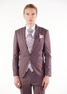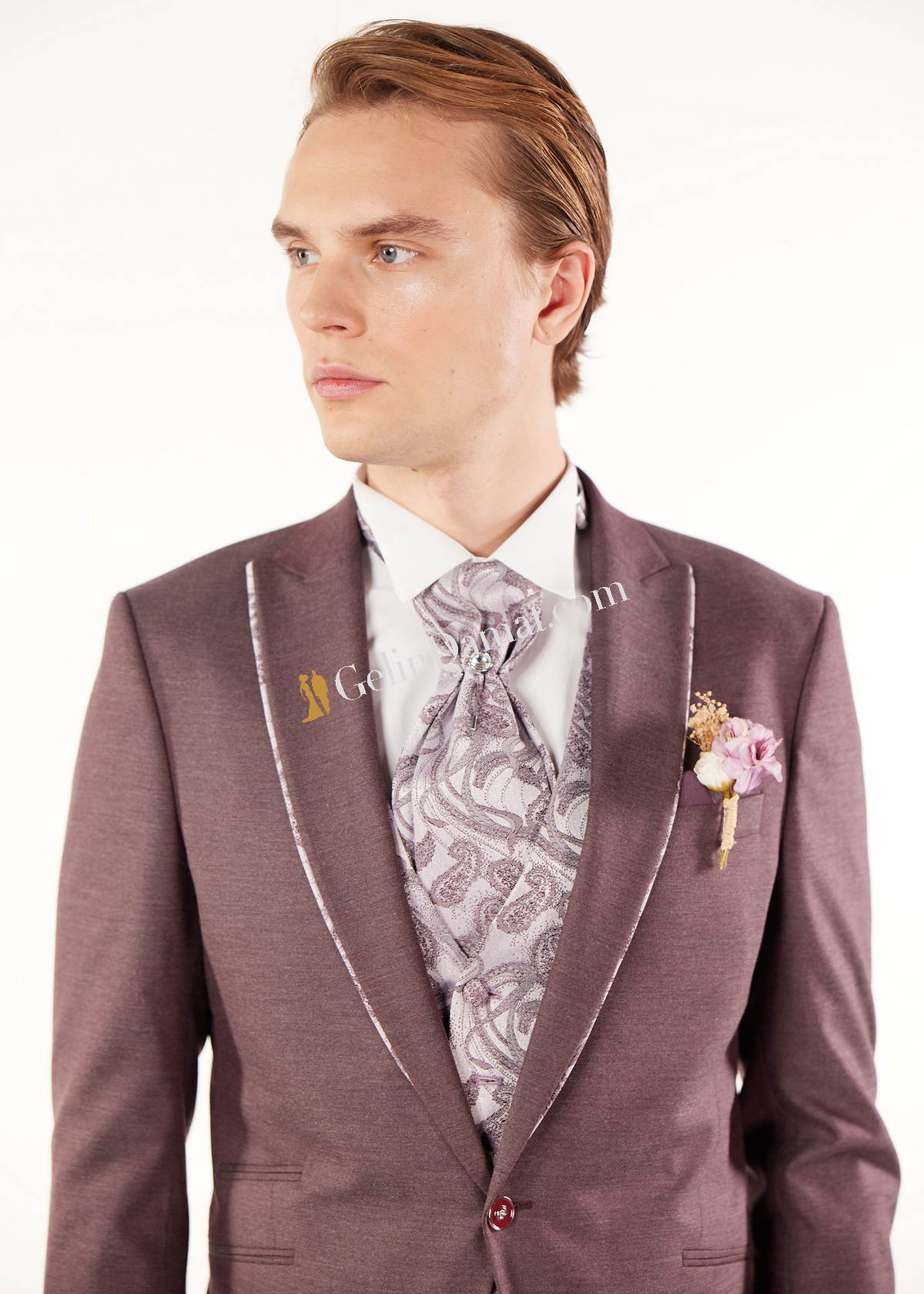 Şık Desenli Yelekli Bordo Damatlık Takımı