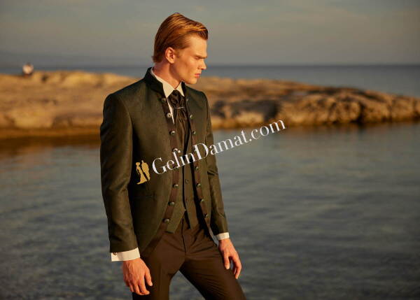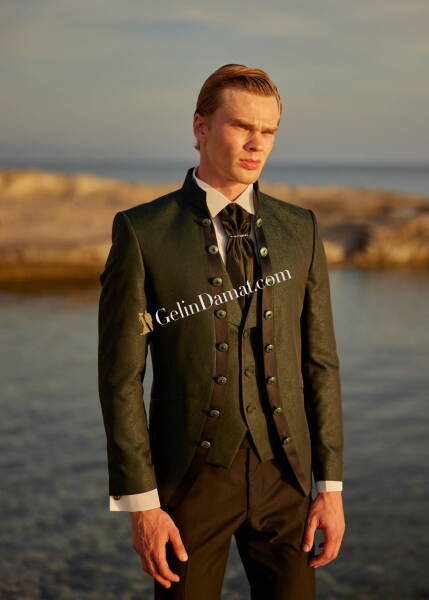 Şık Ceket Detaylı Koyu Yeşil Damatlık Takımı