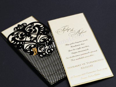 Gelin Damat Davetiye markasının özenle hazırladığı bu davetiye, yüksek kaliteli malzemesi ve estetik detaylarıyla dikkat çeker.