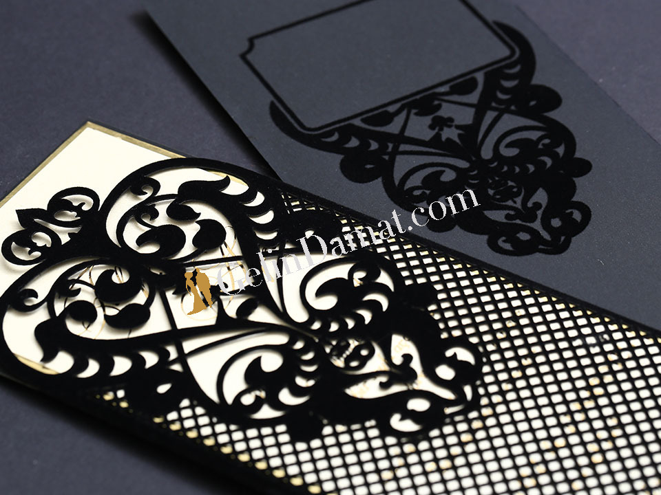 Siyah Kadife Özel Kesimli Modern Davetiye, siyah kadifenin zarafetiyle özel kesim detaylarını birleştirerek şık ve etkileyici bir tasarım sunar. Modern çizgileri ve göz alıcı dokusuyla, davetinizin unutulmaz bir başlangıç yapmasını sağlar.