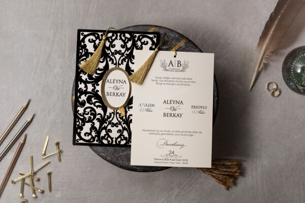 Gelince Haber VerGelin Damat Davetiye markasının zarif tasarım anlayışıyla üretilen Siyah Kadife Püskül Detaylı Davetiye, şıklığı ve zarafeti bir araya getiriyor. Düğün davetiyesi fiyatlarına KDV dahildir. Lüks siyah kadife dokusu ve zarif püskül detayları ile modern ve klasik şıklığı birleştirir. Yüksek kaliteli kağıt yapısı ve zarif tasarımı, düğün, nişan ve diğer özel organizasyonlar için mükemmel bir seçenek sunar.