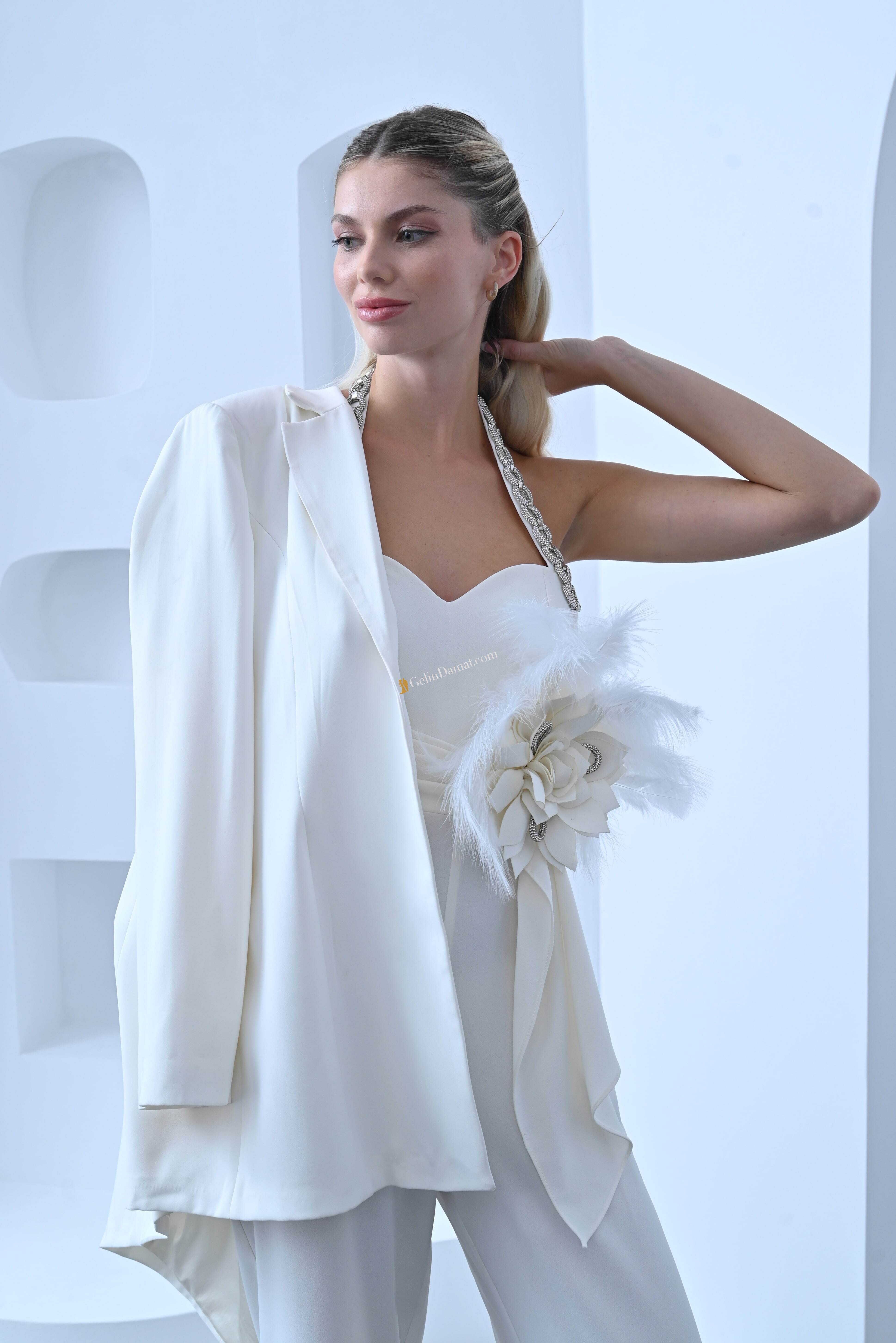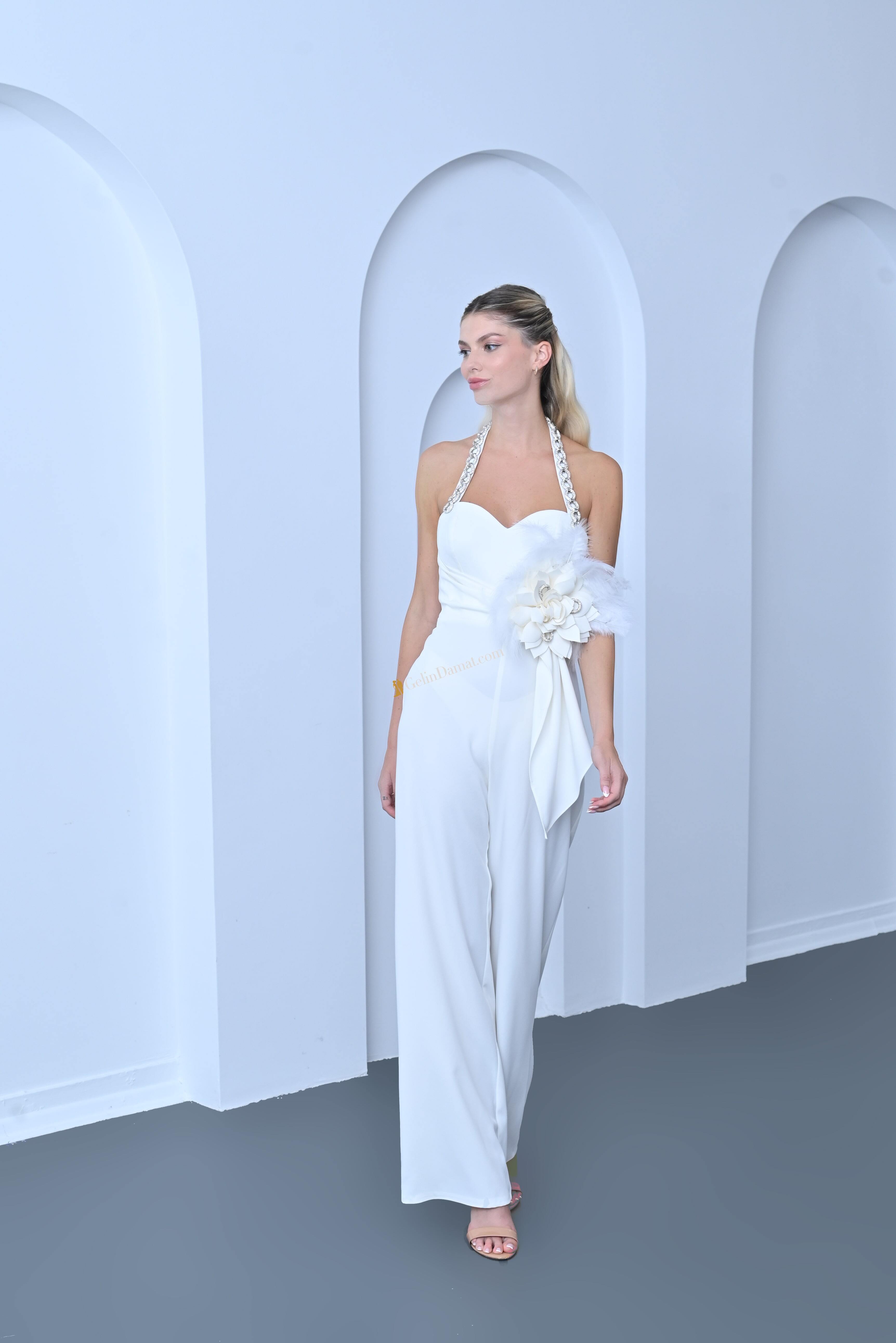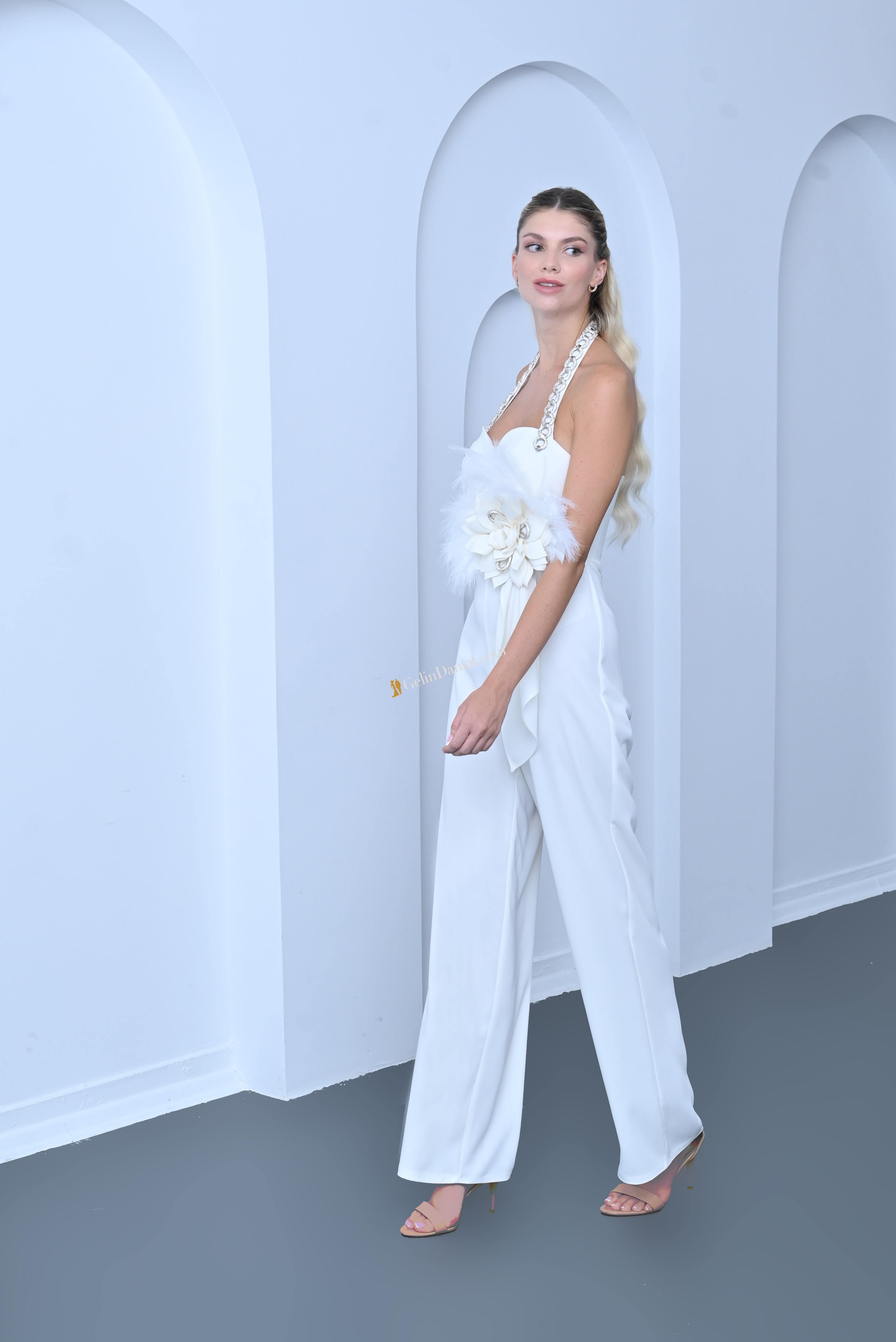 Gelin Damat Markası olarak, bu özel tasarım ile her anınızı taçlandırmanıza yardımcı olmaktan mutluluk duyuyoruz. Çiçek tüylü ince askılı tulum elbise, tüm gözlerin üzerinizde olmasını sağlayacak ve unutulmaz anılar yaratmanıza katkıda bulunacaktır.