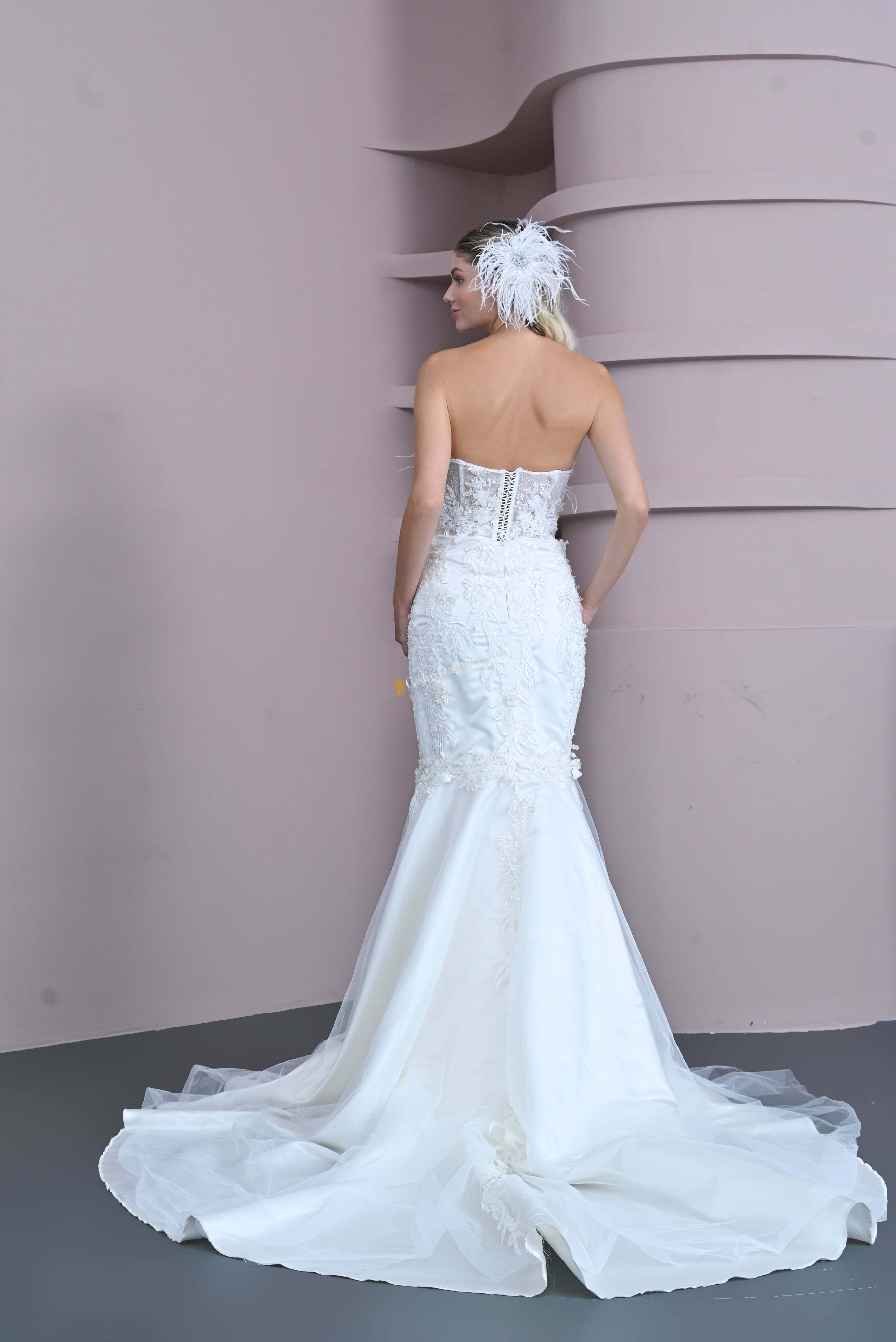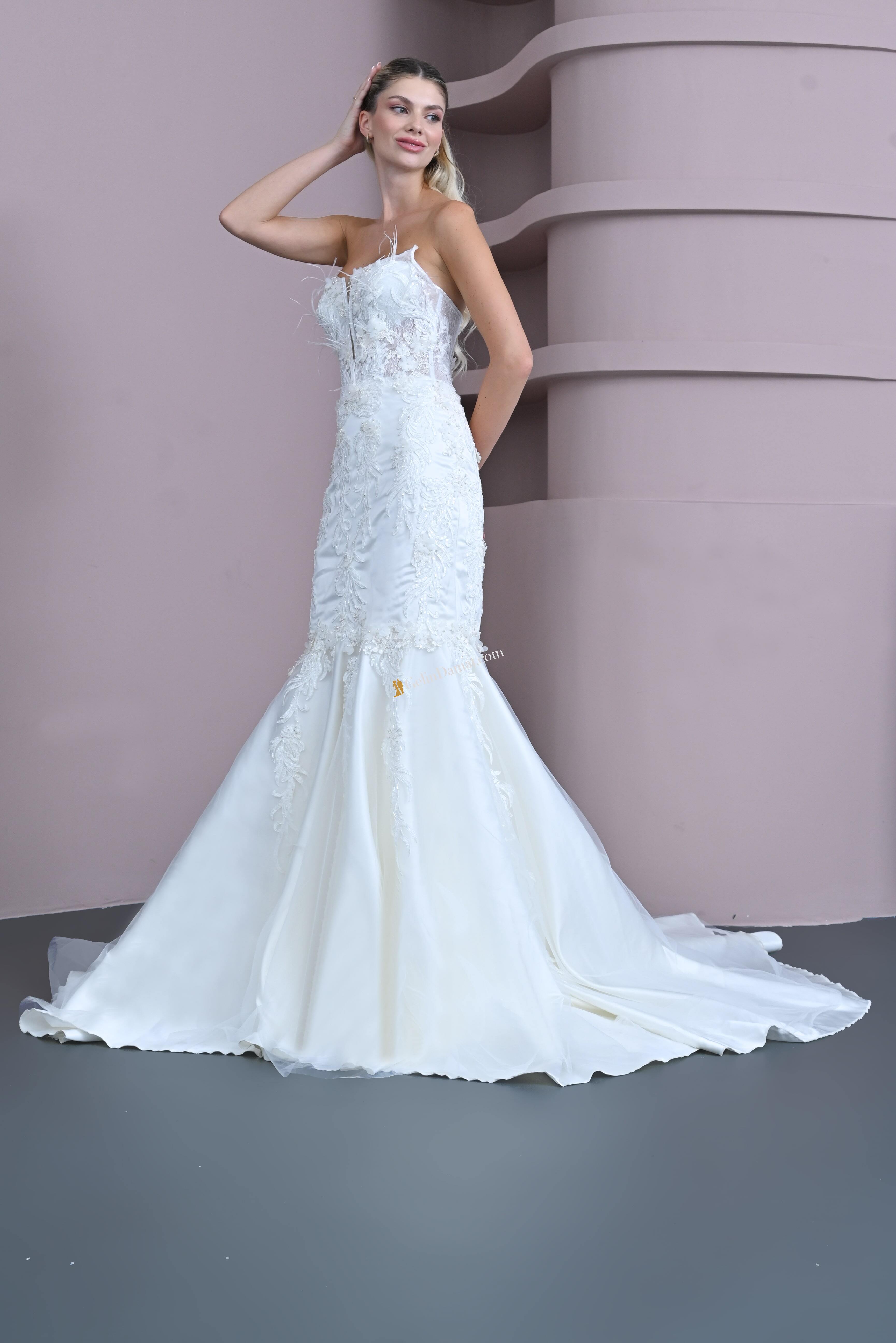 Gelin Damat Markası olarak, bu özel tasarım ile en özel anlarınızı taçlandırmanıza yardımcı olmaktan mutluluk duyuyoruz. Straplez dantel detaylı dekolteli gelinlik, tüm gözlerin üzerinizde olmasını sağlayacak ve unutulmaz anılar yaratmanıza katkıda bulunacaktır.